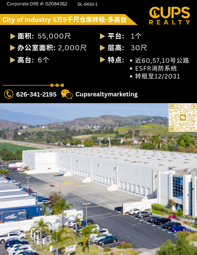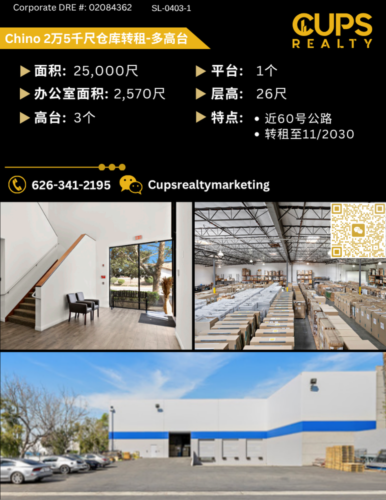 Chino warehouse for sublease 奇诺2万5千尺转租 ✔️面积:25,000 SQFT ✔️办公室:2,570 SQFT ✔️高台:3个 ✔️平台:1个 ✔️层高:26尺 🌟近60号公路 🌟转租至11/2030 欢迎加微信咨询: Cupsrealt ...