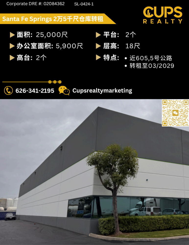 Santa Fe Springs warehouse for sublease Santa Fe Springs仓库4万5签尺转租 ✔️面积:45,000 SQFT ✔️高台:6个 ✔️层高:24尺 🌟近5,605号公路 🌟仓库可分租(20-46K) 🌟转租至05/2029 欢迎加微信 ...